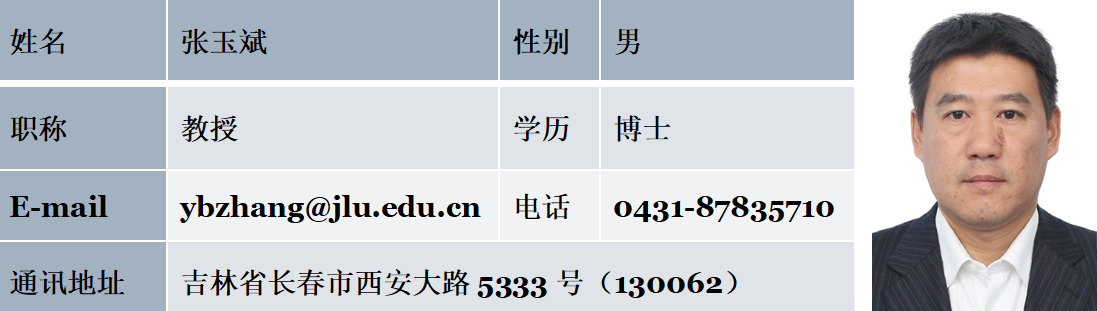 张玉斌(1977-),男,山东莒南人,博士,教授,硕士研究生导师。主要从事土壤侵蚀与水土保持、土壤退化与修复、作物高产高效等方面的研究。吉林省土壤学会理事(科普工作委员会副主任)、吉林省黑土地保护与利用标准化技术委员会委员,中国植物营养与肥料学会会员,中国水土保持学会会员。主持科研项目10余项,发表论文60余篇,参编2部编著,获省部级奖励3项,F5000论文1篇。