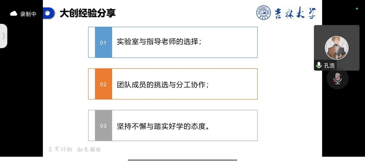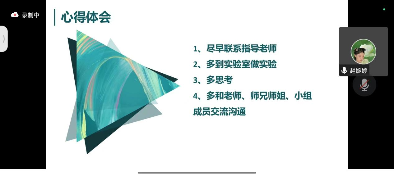 分享会上,2019级本科生王飞启、赵婉婷、孔浩等3位优秀学生代表作了分享报告。3位同学从自身实际出发,结合从事大创项目研究经历,围绕“大创的意义和作用”“大创申请的注意事项”“如何结合大创开展科研训练”“加强与指导教师的沟通交流”等多方面内容交流心得,从课题选择、实验过程、团队分工等方面分享宝贵经验。3位分享者对同学们提出的相关问题进行了耐心解答,鼓励同学们抓住机遇,踊跃参与,在竞赛中进步、在竞赛中成长。