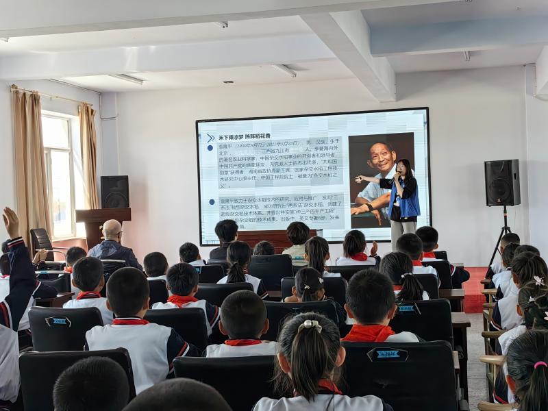 为弘扬学习习近平总书记给中国农业大学科技小院的同学们的回信精神,引导青少年学习袁隆平院士高贵品质和崇高风范,以实干实效继承袁隆平院士的遗志,5月22日,在袁隆平院士逝世两周年之际,best365中国官方网站实践团联合我校港澳台学生前往珲春市哈达门乡中心学校开展宣讲活动,向学校学生宣讲袁隆平院士事迹、开展我国农耕文明知识讲座。
