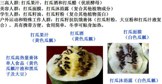 打瓜,又称籽瓜,为籽用西瓜的简称,属于葫芦科西瓜的变种,主要分布于我国吉林,甘肃,山西,内蒙等地区。本草纲目记载"籽瓜性味甘, 入心脾胃,内有解心脾胃热,止消温, 是一种具有较高营养和药用价值的农产品。打瓜富含多糖、果胶、维生素、黄酮类和微量元素等多种保健成分。项目利用打瓜皮开发功能果蔬粉,打瓜瓤开发功能饮料,功能酒,功能醋,沐浴露和面膜,利用打瓜籽开发高端油脂等。