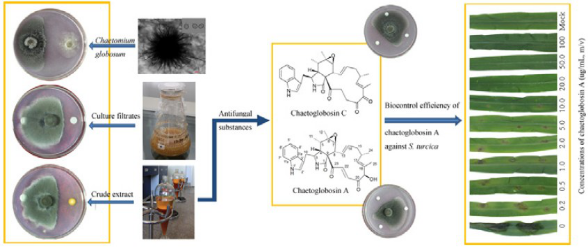 真菌的次生代谢产物具有结构新颖,药理活性突出的特点,利用真菌产生的强抗菌化合物开发生物杀菌剂已经有很多成功的例子。毛壳菌素是由一株银杏内生球毛壳菌 (Chaetomium globosum)产生的一类吲哚类生物碱,经过试验发现,该类生物碱对40多种农业和食品病原真菌表现出光谱抗性,对很多病原菌活性超过对照杀菌剂纯品。同时发现了这类生物碱的杀线虫活性。在此基础上,课题组成果开发出一种毛壳菌素生物杀菌剂用于农作物土传真菌病害以及地下根结线虫综合防治剂,可以广泛应用于温室农作物,蔬菜及花卉地下病虫害防治。