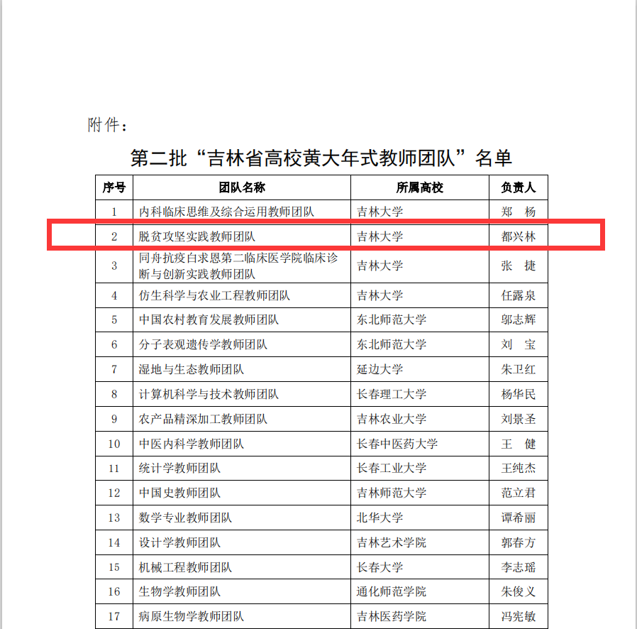 此次吉林省教育厅共认定22个团队为“吉林省高校黄大年式教师团队”,best365中国官方网站院长都兴林教授带领的“脱贫攻坚实践教师团队”成功入选。