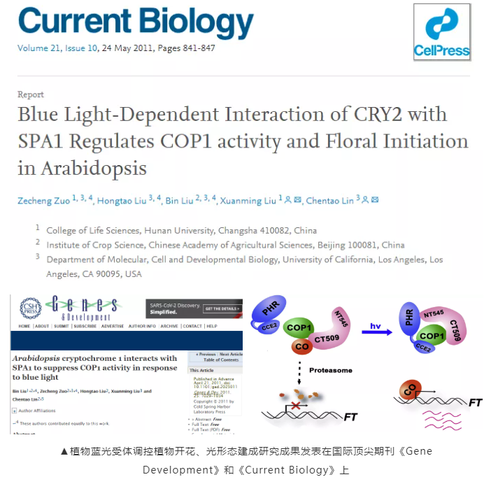▲植物蓝光受体调控植物开花、光形态建成研究成果发表在国际顶尖期刊《Gene Development》和《Current Biology》上