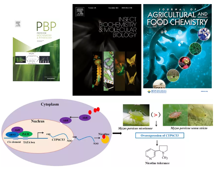 粮食安全是国家安全的重要基础,而害虫治理是保证粮食丰产丰收的重要措施之一。在我国,化学防治是害虫治理的一项重要措施。害虫抗药性是导致害虫猖獗的重要原因之一,也是影响杀虫药剂使用效果的关键因子。阐明害虫的抗药性风险及机制是解决目前害虫抗药性和药剂安全使用问题的关键,团队针对我国重要农业害虫,如棉/瓜蚜、斜纹夜蛾等害虫开展系统的抗性风险评估与抗性机理研究,及杀虫剂对非靶标昆虫蜜蜂造成行为失调的分子机制研究。通过生物化学、RNAi技术、真核细胞表达及UAS-GL4等研究手段揭示了多个代谢途径(CSP化感蛋白、P450、UGT、ABC转运蛋白)共同介导了棉蚜高水平抗药性的发生。阐明了棉蚜对新型杀虫剂-螺虫乙酯、溴氰虫酰胺的靶标抗性和代谢抗性机制;明确了螺虫乙酯、溴氰虫酰胺与高效氯氰菊酯存在交互抗性;针对抗性蚜虫,研发出4种负载多种活性成分的农药微胶囊制剂。以上研究成果为广谱性抗性棉蚜的防控以及新型杀虫剂的科学应用奠定了基础。相关研究成果在Insect Biochemistry and Molecular Biology、Journal of Agricultural and Food Chemistry等期刊发表。