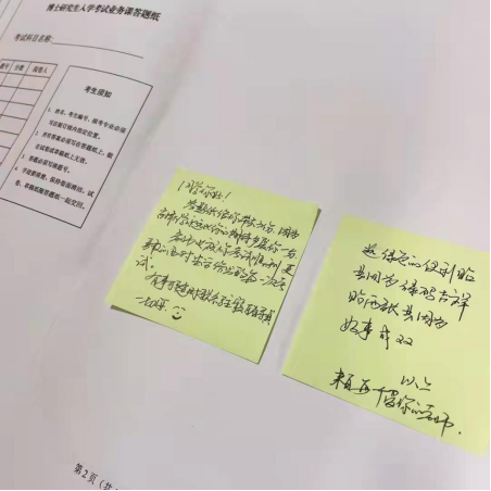 研究生就业和考博正好赶在这个期间,只能线上进行,关乎学生前途的事情不能马虎。3月14日,1名研究生获知其申请的博士考核单位将于3月16日-17日进行线上考核,复试要求自行准备B4双面答题卡2份,并在独立、封闭的空间完成。得知此事后,秦建春多次与学校、考生、复试考核单位等积极沟通,一方面联系校区学工办和研工办的老师们帮忙打印,另一方面与公寓管理部门协调安排空寝室为学生提供复试场地。3月15日上午,一切准备就绪,在送给该名学生的答题卡上,贴着两张绿色的便利贴,上面写着:
