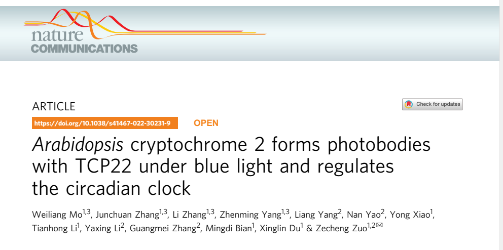 2022年5月12日,best365中国官方网站杨振明团队的左泽乘课题组在Nature Communications杂志上发表题为“Arabidopsis cryptochrome 2 forms photobodies with TCP22 under blue light and regulates the circadian clock”的研究论文,该研究首次解析了蓝光受体CRY2(Cryptochrome 2)在蓝光下调控生物钟的分子机制。