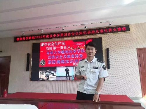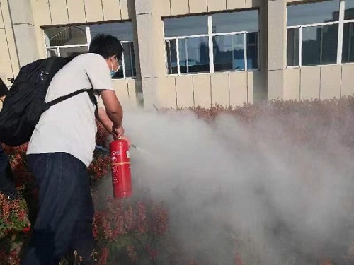 在安全知识讲座环节,王长超教员依次从消防知识、火场逃生、自救知识以及消防器材使用、检查和维护等方面对师生进行了培训。王长超教员以近期发生的几起大型火灾事故为例,深入浅出地向在座师生讲解了生活中常见火灾场景的逃生方法及事故发生后的正确应对流程。同时也指出了一些生活中的防火小技巧,如燃气着火要及时关闭燃气罐上的阀门,油锅着火应先关闭燃气和抽油烟机再使用灭火毯灭火,出门时应注意人走电断,防止电器自燃等。强调了火灾发生时容易被忽视但却至关重要的生活常识,在场师生受益匪浅。在灭火演习环节,王长超教员讲解了干粉灭火器、水基灭火器等消防器材的使用方法,并指导大家进行灭火器现场实际操作演练,多名师生参与演练,并在实际操作中熟悉消防器材的正确使用方法。