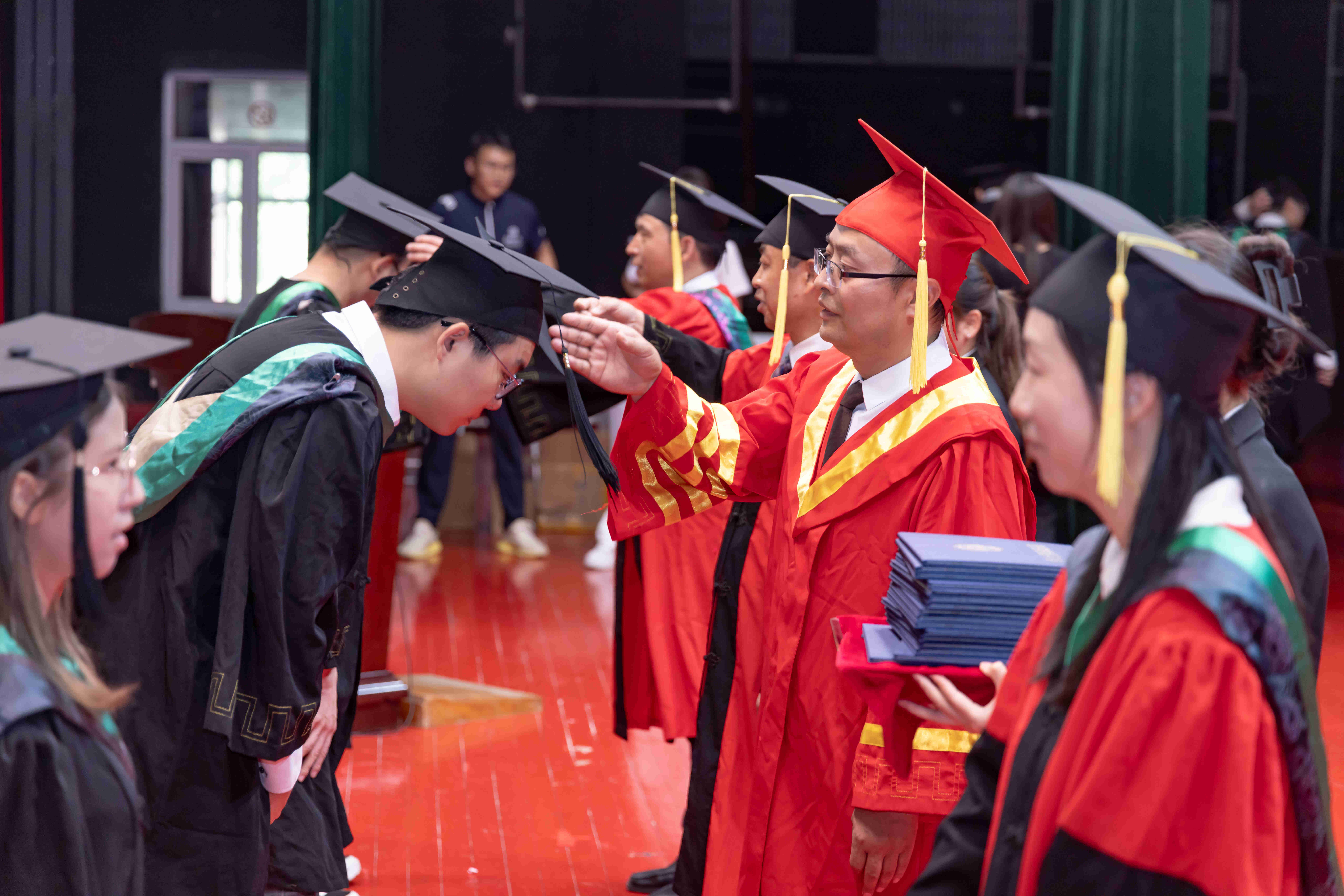 主礼教授秦建春、都兴林、边少敏、曹宁为毕业生授予学位、拨动流苏并合影。在庄重而喜悦的氛围中,2025届全体毕业生身着学位服,依次走上主席台。