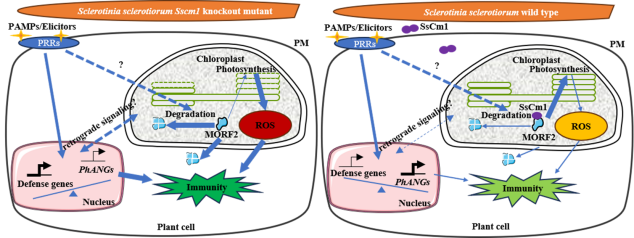 与之对应的是,严重危害作物生产的死体营养型植物病原真菌核盘菌进化出一个非酶功能的效应子SsCm1,在侵染早期通过分泌SsCm1直接靶向并稳定MORF2,进而迟滞了叶绿体从光合状态向免疫状态的转变,最终抑制叶绿体免疫和促进侵染早期的定殖。