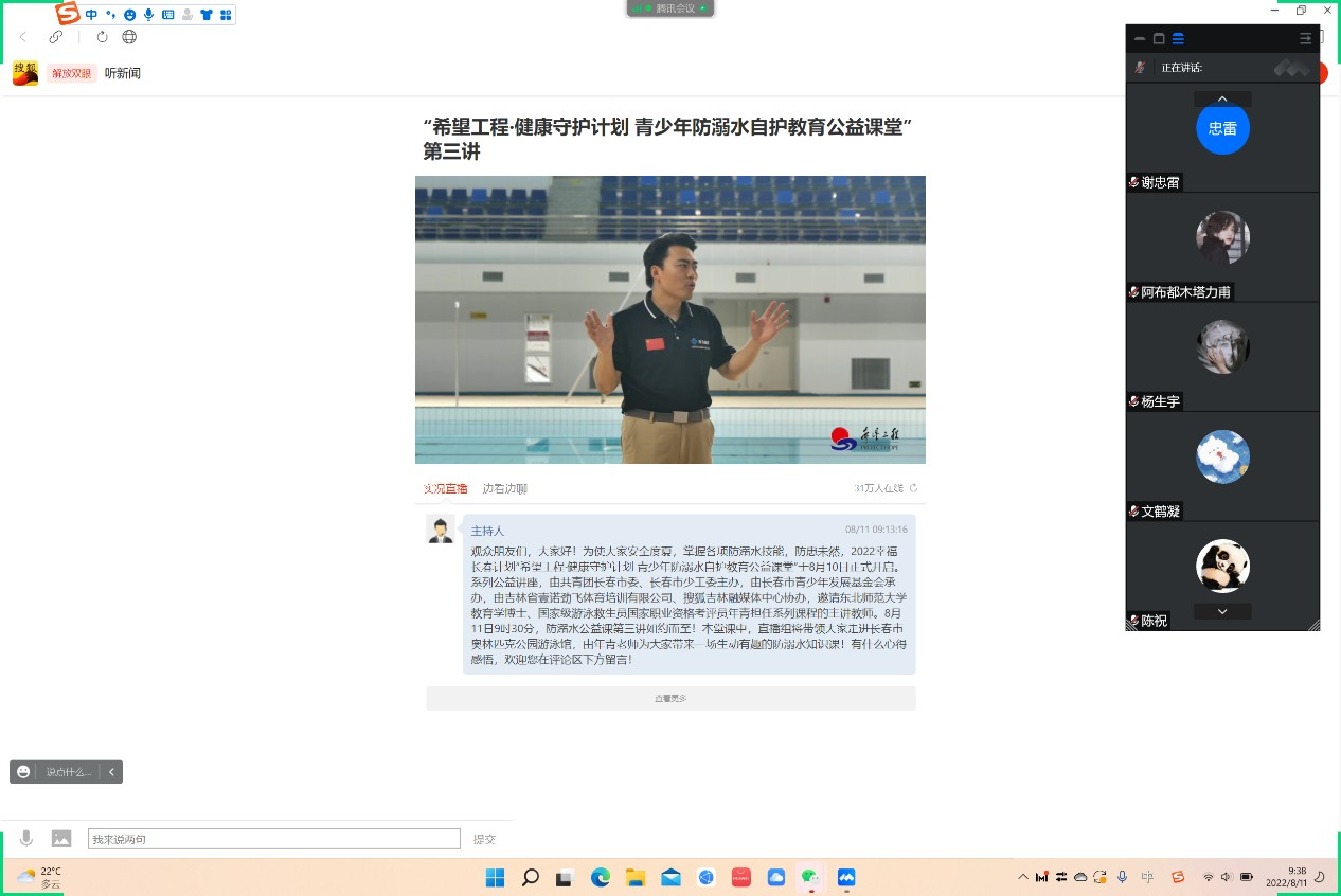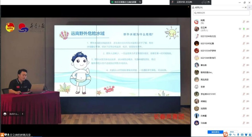 为积极响应团市委重视青年防溺水自护教育工作号召,创设更安全的学习生活环境,8月10日下午,best365中国官方网站团委组织学院全体团员于线上收看青少年防溺水自护教育公益课堂讲座,学习防溺水的重要性和生活中的一些基础急救知识,以增强学生应对突发情况的自救意识,更好地保障自己及身边人的生命安全。