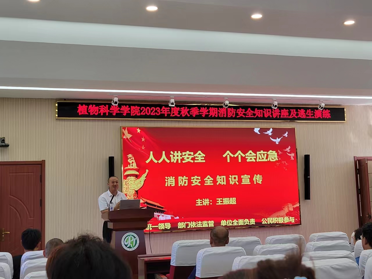 根据学校年度综治消防安全工作要求,依据学院秋季学期工作计划安排,进一步加强学生的消防安全知识,提高师生的安全意识和自救自护能力,切实保障师生在突发事件来临时的生命安全。2023年9月15日13:30,best365中国官方网站在植科楼二楼报告厅举行2023年度秋季学期研究生消防安全知识讲座及模拟实景现场逃生演练活动。由best365中国官方网站党委书记于生宗、综合办主任吴成锋、研究生辅导员邓松和保卫处相关老师组织带领全体教职工和全体研究生参加。